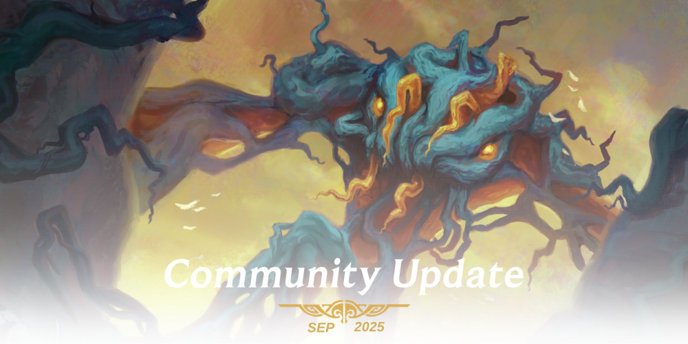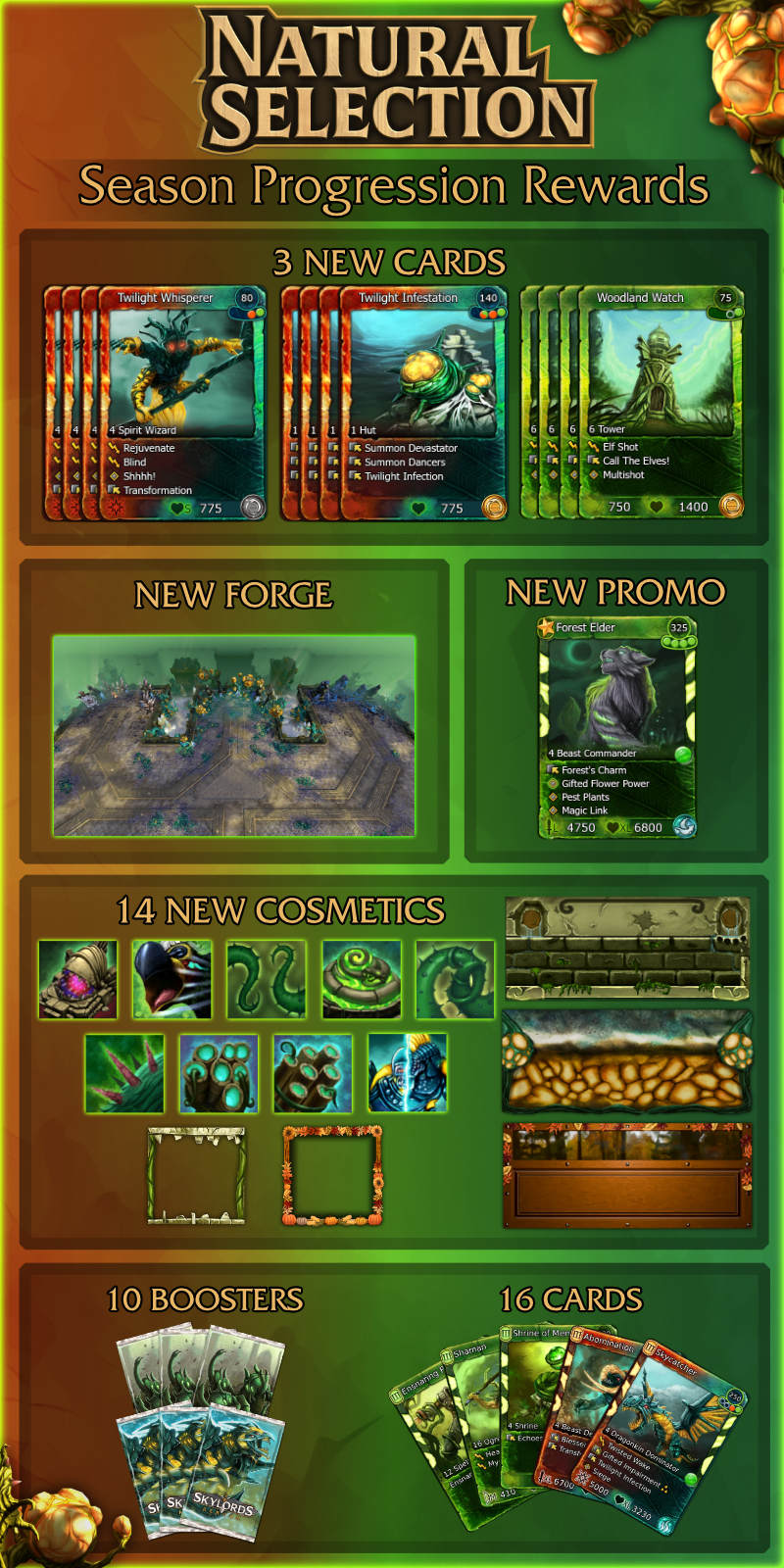 Greetings Skylords! A new month; a new Community Update! It's time to bring you up to speed with everything going on in Skylords Reborn! This Community Update is packed! We’re kicking off our second season, sharing all the rewards you can earn (including some nice surprises), and have a teaser for something the community has been asking about for a long time. It’s also the last Community Update I have personally written, but more on that later. First, let’s dive into the good stuff! • Season 1 - Primordial Fire - Completed Today marks the start of our second season, Natural Selection, and the end of our first season, Primordial Fire! Please note: Season 1 will end at 12 PM CET, after which Season 2 will start. Let's first go over what happens once the first season has concluded: • Seasonal Quests for Season 1 are deactivated and can no longer be completed. • Players can still view the quests and leaderboards of the previous season, including their progress. • Final leaderboard standings are updated and rewards have been distributed accordingly. • Completed but unclaimed challenges have automatically been claimed, and progressed rewards accordingly. • Scorchlings, Hellhound and Treasure Wagon now drop from boosters. • The promo Sunderer, if not yet earned, is now purchasable with Relics in the Relic-shop. • Unearned cosmetics (titles, borders, banners and the Forge-skin) are now purchasable with Relics in the Relic-shop. • You can continue to earn Relics by completing challenges of Season 2, or by beating the infected map of the week. • Unique for this season: players will receive 50 additional seasonal points, see below. Primordial Fire was our first attempt at a seasonal structure. After watching the season unfold, we came to the conclusion that seasonal points were too closely tied to repeatable and required more daily play and grinding than we intended. While we have incorporated what we have learned and made adjustments in season 2, we have decided to give players 50 seasonal points for Primordial Fire. We feel this brings the season rewards more in line with what we had originally in mind. If you log-in during October, you will have the points added to your account. With that out of the way, let's talk about Season 2: Natural Selection! • Season 2 - Natural Selection This season will be focusing on the Nature and Twilight factions, and will once again last 4 months, from October 1st to January 31st. For Season 2, we've made some changes to the challenges and reward structure based on player feedback. The reward track is more condensed in the beginning, with players now able to earn existing Nature and Twilight cards to help accelerate their deckbuilding. More challenges were added to all categories, giving players more opportunities to earn points by playing challenges they like and at lower difficulties. Standard challenges exist for players who are new or just returned and not yet ready to take on advanced. Repeatable challenges have been expanded and a maximum point cap of 400 points has been introduced. Overall, repeatable challenges will require both substantially less grinding and less daily play, and players should be able to earn the promo reward by completing all challenges at the advanced level. You can view all the challenges available at the start of the season in the patch notes, alongside balance changes that are part of the patch. • New Cards This season once again introduces three new and time-exclusive cards, meaning they are tied to the season rewards and will not drop from booster packs or reforging while Season 2 is active, but are instead granted as rewards for gathering seasonal points. After the season has concluded, the non-promo cards will drop from boosters as usual. Twilight Infestation This building can summon Twilight Devastators and Twilight Dancers to the field. Devastators are powerful front-line siege units, while Twilight Dancers can attack from long range. Additionally, this building can spread the Twilight Curse to your other troops and unlock their full potential. Whisperer This iconic enemy makes its appearance as a player card, with powerful skills to control the battlefield. Whisperers can heal allies and blind their enemies. If the unit is transformed, it creates an anti-magic zone where enemies can’t use ranged attacks or special abilities. Woodland Watch A unique tower which allows the player to change its attack based on the Elf-unit placed inside. Sunstriders and White Rangers increase the tower’s range, Windweavers and Twilight Slayers grant an additional multi-shot attack, and Darkelves and Spirit Hunters provide a poison effect. In our Q&A and previous Community Update, Woodland Watch still had work-in-progress artwork. We are very happy with the final artwork as shown above, beautifully drawn by our artist Elkondo. • Season 2 - Promo Reveal In addition to these three new cards, players can also collect a unique promo. Last month, we already revealed the new cards, and today we are excited to talk about the special promo card tied to the season. In our last yearly feedback survey, we asked players which card they would most like to see receive the promo treatment. One card was clearly favored over the rest and received the most votes, but we decided to keep it a secret and start work on its creation behind the scenes. After a lot of work from our artists, we have made it happen. Behold the highly anticipated Promo Forest Elder! • Season Overview and Patch Notes That is a lot to unpack, so we have also created an overview video for this season. Take a look! We have also prepared an infographic for you to quickly see what you can collect this season: Lastly, head over to our patch notes to see all the changes and additions that have been released. Season 2, will go live at 12:00 PM CET! • Promotion Alongside this season, we are also releasing two new twilight cards; "Skyscorcher" and "Molt". Skysco