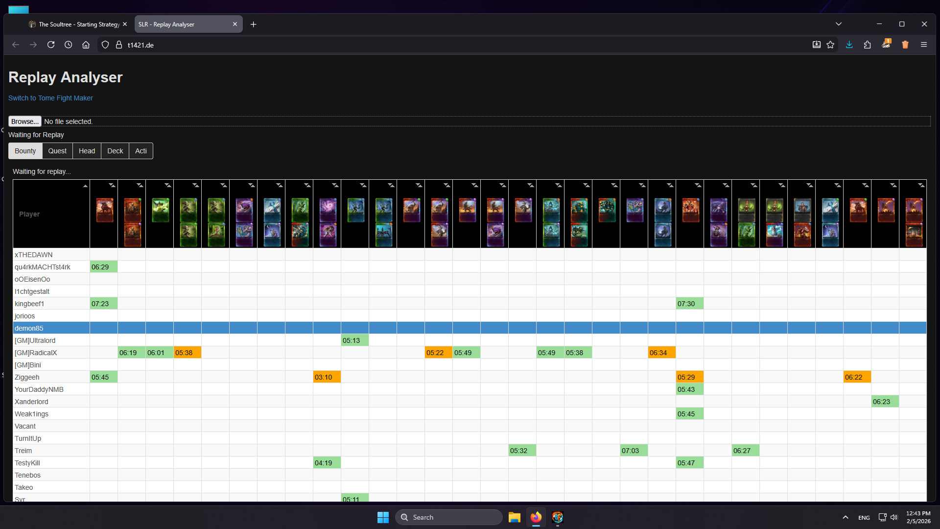 Ultralord Posted January 5 Share Posted January 5 Great greetings, People of the Sky Let's start the Event year of 2026 with a kind of event were everyone can win. The Challenge: Play and win the Community map "The Soultree Bounty" The map "The Soultree Bounty" is identical to the normal Soultree map, but ends as soon as you kill the last unit of the first big wave. Right when Viridya travels to the Soultree. Play on expert difficulty You are only allowed to play up to 2 different cards. You can summon / cast / build these two cards as often as you like. The amount does not effects any ranking. You may only use cards from Tier 1 and Tier 2. The Ranking: Mini Ranking: If you upload at least one valid run you receive one Mini Booster. General Ranking: If you upload five or more runs with different decks the mini booster will be upgraded to a General Booster. Unique Deck Ranking: Each card in your deck receives points equal to the amount of uploaded runs with that card in it. For example your deck contains Pyromaniac which was used 100 times, and Sunstriders with 20 uses. Your points would be 120. The lower your points the higher your rank. (Tie breaker fastest run -> then upload date) There are separate rankings for one and two card runs. There is one Point-Pool. That mens the 100 uses of Pyromaniac also apply to a One-Card-Run! The Event Timeline / Send in your Replay: Map: The Soultree Bounty Difficulty: Expert Goal: Beat the map Until when: 15.02.2026 23:59 CET Winner Stream: 20.02.2026 19:00 CET via my Twitch (https://www.twitch.tv/ultralord_t1421) How to join: Upload your Replay at https://t1421.de You can upload as often as you like. Save new decks and updates the time for existing decks. Replays can be found in your Documents folder (C:\Users\xxx\Documents\BattleForge\replays\) How to play the map: Spoiler To access the map for the contest (or any community map), select the blue icon in the far lower right corner: Search for "The Soultree Bounty" If you have problems downloading/starting the map, you can try to clean up your map folder and try again: Close BattleForge, delete all files in C:\Users\xxx\Documents\BattleForge\map\, and try again. The Prizes: Mini and General boosters for one and 5 runs are awarded to all players no matter there Unique Deck Ranking You only receive one prize in the Unique Deck Ranking, even if you are have a One and Two card placement. Tie breaker for equal points is the play time (and if that is equal as well, then its the upload date) Unique Deck Ranking One/Two-Card Deck: 1st Place: + Lyrish Knight (Promo) 2nd Place: + Avatar of Frost 3rd Place: + Harvester 4th Place: + Cluster Explosion [R] 5th Place: + Parasite Swarm 6th Place: + Lost Warlord [B] 7th Place: + Wrathgazer 8th Place: + Wheel of Gifts 9th Place: + Bloodhorn [R] 10th Place: + Sanctuary [G] Thank you to: SR-Team For One-Run Mini Boosters and Five-Run- General Boosters @Vultagx For 30x General Boosters @ElementG For 2x Wrathgazers @Chinchilla For 1x Lyrish Knight (Promo) @Ziggeeh For 1x Avatar of Frost Anonymous For 1x Wheel of Gifts, 2x Bloodhorns [R], 2x Sanctuary [G] @Ultralord For 1x Lyrish Knight (Promo), 1x Avatar of Frost, 2x Harvester, 2x Cluster Explosion [R], 2x Parasite Swarm, 2x Lost Warlord [B], 1x Wheel of Gifts, 30x General Boosters I feel many new player struggle with the first 6 min of this map and this event should be providing a lot of strategies players can try out If you want to host your own event, feel free to contact me or @Metagross31 See you in the forge, fellow Skylords Ultralord 🎩 FAQ: Spoiler When will I receive my rewards? - Prizes will be send out in the days following the winner stream. How do Promo Cards work? - To keep it fair, all Promo are converted to the "normal" card for this event. - Easter egg counts a no card at all. (You still can only play 2 cards inkl. Easter egg on the map) - Edit 10.02.2025: If you play with a Promo card and and the same none pomo card, the website will show it as a One Card Run But for the final Ranking it will be a 2 counted as a 2 Card run! What about affinities? - Affinities count as different cards. How does the points work? 1. Count the card uses of all cards. 2. Apply the Card-Use-Count to each run. 3. Split the Runs in One and Two Card runs, and rank them by total Points. 4. Check of tie breakers RadicalX, Metagross31, Krapper and 1 other like this Link to comment Share on other sites More sharing options...