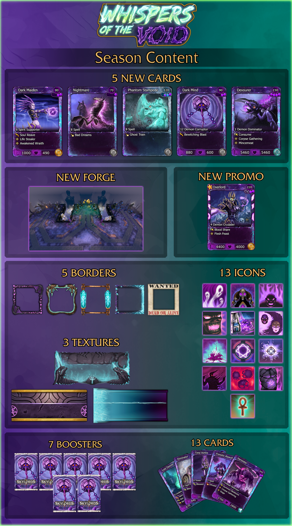 WindHunter Posted March 1 Share Posted March 1 Patch #400055 - Whispers of the Void Welcome to our newest patch. This update contains our twenty first balance patch for the game, the release of Season 3, 5 brand-new cards, quality of life changes, and much more! Patch Preview Face 43 new challenges and earn cosmetic and card rewards over four months as part of Season 3, Whispers of the Void! Five new cards and one new promo are now available! Jump in-game to collect Nightmare, Dark Maiden, Dark Mind, Devourer, Phantom Stampede and promo Overlord! Players can now purchase two new borders in the Relic Shop as well as any Season 1 & 2 cosmetics they missed. Substantial balance changes and reworks to Shadow and Lost Souls cards. A new way to organize your decks! Many fixes and QoL changes based on community requests. Season 3 - Whispers of the Void This patch introduces our third season. Our seasons system is based around challenges that the player will complete over a 4-month time period (in this case March 1st to June 30th). Shown below are all rewards available this season: We were fairly happy with the changes we made to last season's challenge and reward structure, so there are fewer changes going into season 3 than there were going into season 2. The biggest two changes are the introduction of new Maps of the Season and community-wide challenges. Maps of the Season are rPvE maps which will be standard for the entire length of the season, allowing players to choose the factions they want to fight against in rPvE. The community-wide challenges will give the season a larger sense of community, with the intention being that more active players can help less active players achieve more seasonal progress. As an added bonus, if the community finishes all three community challenges a special border will be unlocked for everyone who participated. Talking about rewards, we have moderately reduced the bfp value of the reward track cards to avoid overly depressing the marketplace like happened at the beginning of season 2. Since the community wide challenges will add some more easily available season points, we took the opportunity to increase the difficulty of the Nightmare challenges to help differentiate players at the top of the leaderboard more. Additionally, we made it easier to earn progress for the repeatable challenge to help other players in challenges. [ Repeatable Challenges ] These are repeatable challenges by which the player slowly accrues points while doing other challenges and simply playing the game. Available from March 1st. Only a maximum of 400 points can be earned from all repeatable challenges. While doing repeatable challenges beyond the 400 point maximum will not reward a player any points, completing any repeatable itself will reward a Relic. Challenge 1.1 Be among the 100 players with the most points earned at the end of the season. Challenge 1.2 Win official campaign scenarios that are the Map of the Day on different days on any difficulty. Challenge 1.3 Win official campaign scenarios that are the Infection of the Week on different weeks on advanced difficulty or higher, or random PvE scenarios that are the Infection of the Week on different weeks on advanced+ (5) difficulty or higher. Challenge 1.4 Win random PvE scenarios that are the Map of the Month on different months on advanced+ (5) difficulty or higher. Challenge 1.5 Play cards in any game mode. Playing Shadow, Amii, Lost Souls, and Bandits cards rewards more mission progress. Challenge 1.6 Win random PvE scenarios. Completing maps both on higher difficulties and with you using decks that contain 10 or more Shadow, Amii, Lost Souls, or Bandits cards you will reward more mission progress. Challenge 1.7 Win official campaign or featured community maps on standard difficulty or higher. Completing maps both on higher difficulties and with you using decks that contain 10 or more Shadow, Amii, Lost Souls, or Bandits cards will reward more mission progress. Challenge 1.8 Spawn units via spell and ability effects (Lost Revenants count) Challenge 1.9 Transfer void power into actual power (normal void return does not count) Challenge 1.10 Be among the top 100 players with the most Elo-score in 1v1 ranked PvP at the end of the month. Challenge 1.11 Win PvP matches (ranked, sparring, BattleArena, etc.) Challenge 1.12 Spend time playing PvP (ranked, sparring, BattleArena, etc.) Challenge 1.13 Help fellow Skylords progress in seasonal challenges. Progress is gained if a Skylord in your party progresses in a non-repeatable challenge up to or below the point where you have already progressed in that challenge. [ One-time Challenges ] The first set of three one-time challenges available from March 1st. The next set with 6 challenges unlocks on April 1st and the last set with 5 challenges unlocks on May 1st. Players will have until the season ends on June 30th to complete them. Challenge 2.1 Win different campaign scenarios or featured community maps on standard difficulty or higher. Demon and Undead units are not allowed. Only Shadow, Lost Souls, or Neutral cards are allowed. These restrictions apply to all team members. Challenge 2.2 Win the 2-player scenarios Crusade and Convoy on standard difficulty or higher. Only Shadow or Lost Souls cards are allowed. Only cards of T2 and below are allowed. These restrictions apply to all team members. Challenge 2.3 Win the 1-player scenario Mo and the 1-player featured community map Rise of a Demon on advanced difficulty or higher. Only Shadow, Lost Souls, or Neutral cards are allowed. No unit cards are allowed. Challenge 2.4 Win 3 different 2-player random PvE scenario Map of the Season presets on Adv++ (6) difficulty. All cards played must cost 100 power or less. Only Shadow cards are allowed. These restrictions apply to all team members. Challenge 2.5 Win the 1-player featured community map A Thirsty Journey Home and the 2-player PvE scenario Sunbridge on advanced difficulty or higher